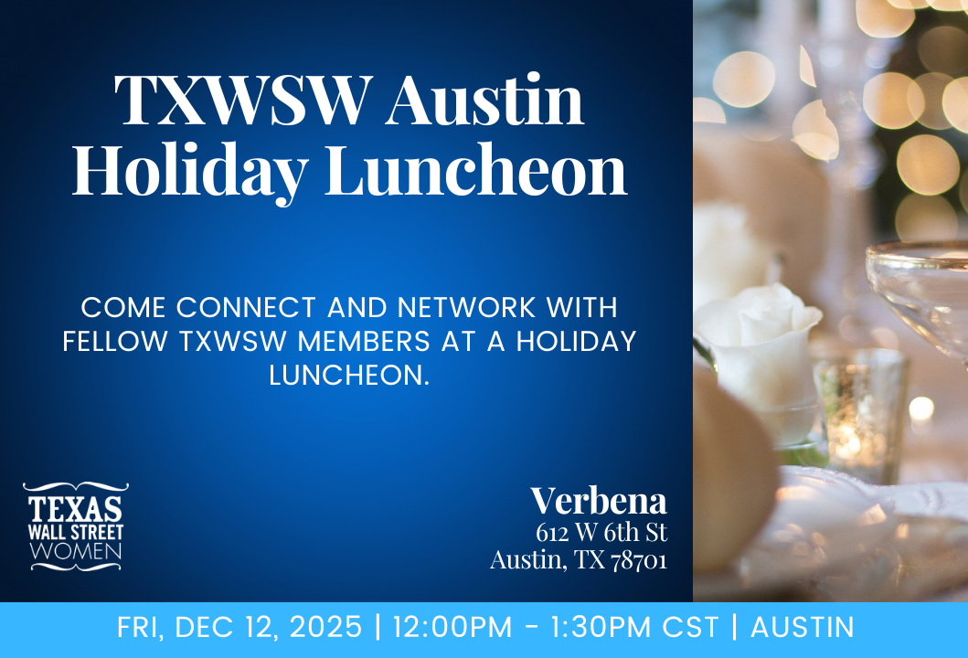 Please join TXWSW Austin for a holiday lunch at Verbena on Friday, December 12 from 12:00-1:30pm. Come connect and network with fellow TXWSW members. Part of the fee for the event goes to support the Young Women’s Preparatory Network.