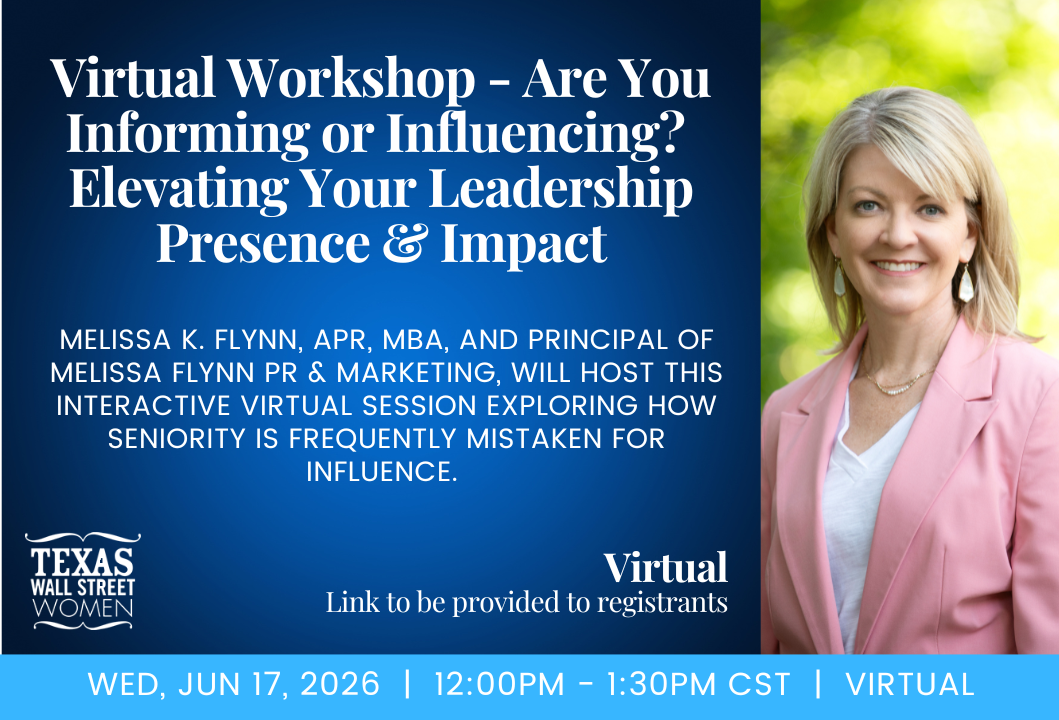 Join Texas Wall Street Women for a high-impact virtual workshop: Are You Informing or Influencing? Elevating Your Leadership Presence & Impact