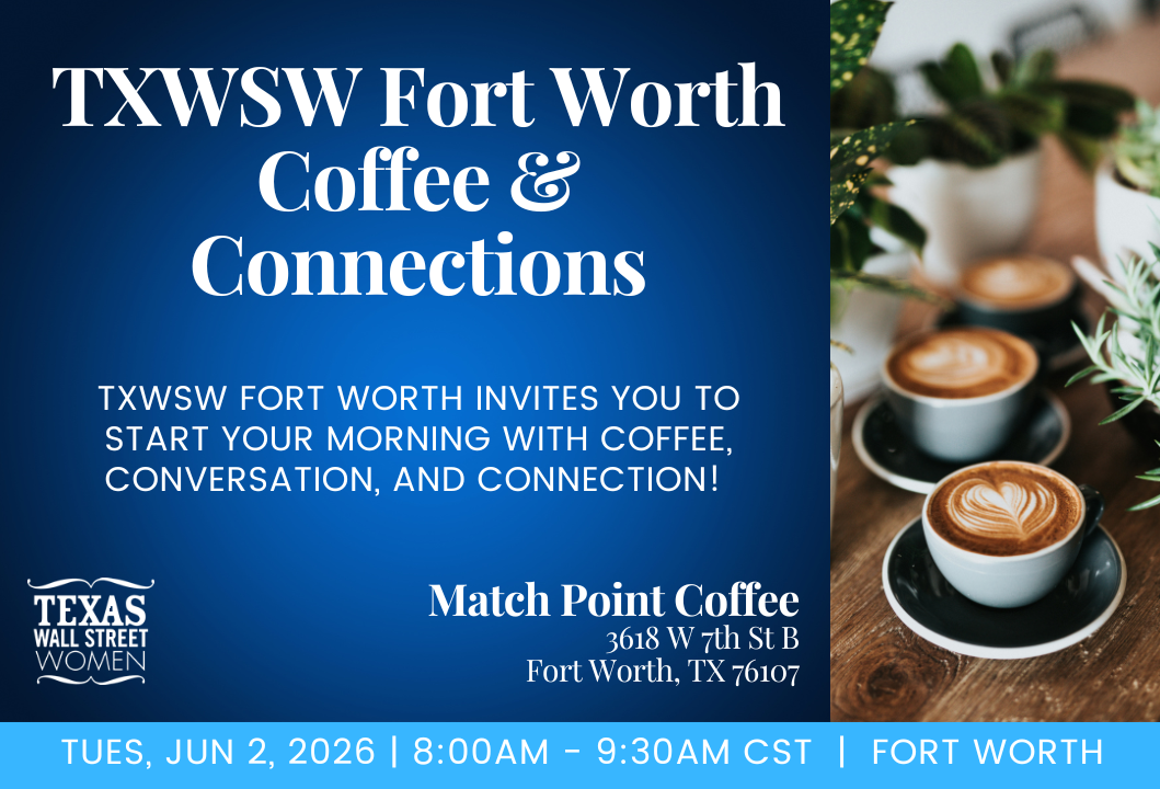 TXWSW Fort Worth invites you to start your morning with coffee, conversation, and connection! Join us in a relaxed, welcoming setting at Match Point Coffee and connect with other professional women in the finance industry. Swing by on your way to work, enjoy your favorite latte or tea (plus a pastry!), and build meaningful connections to kick off your day.